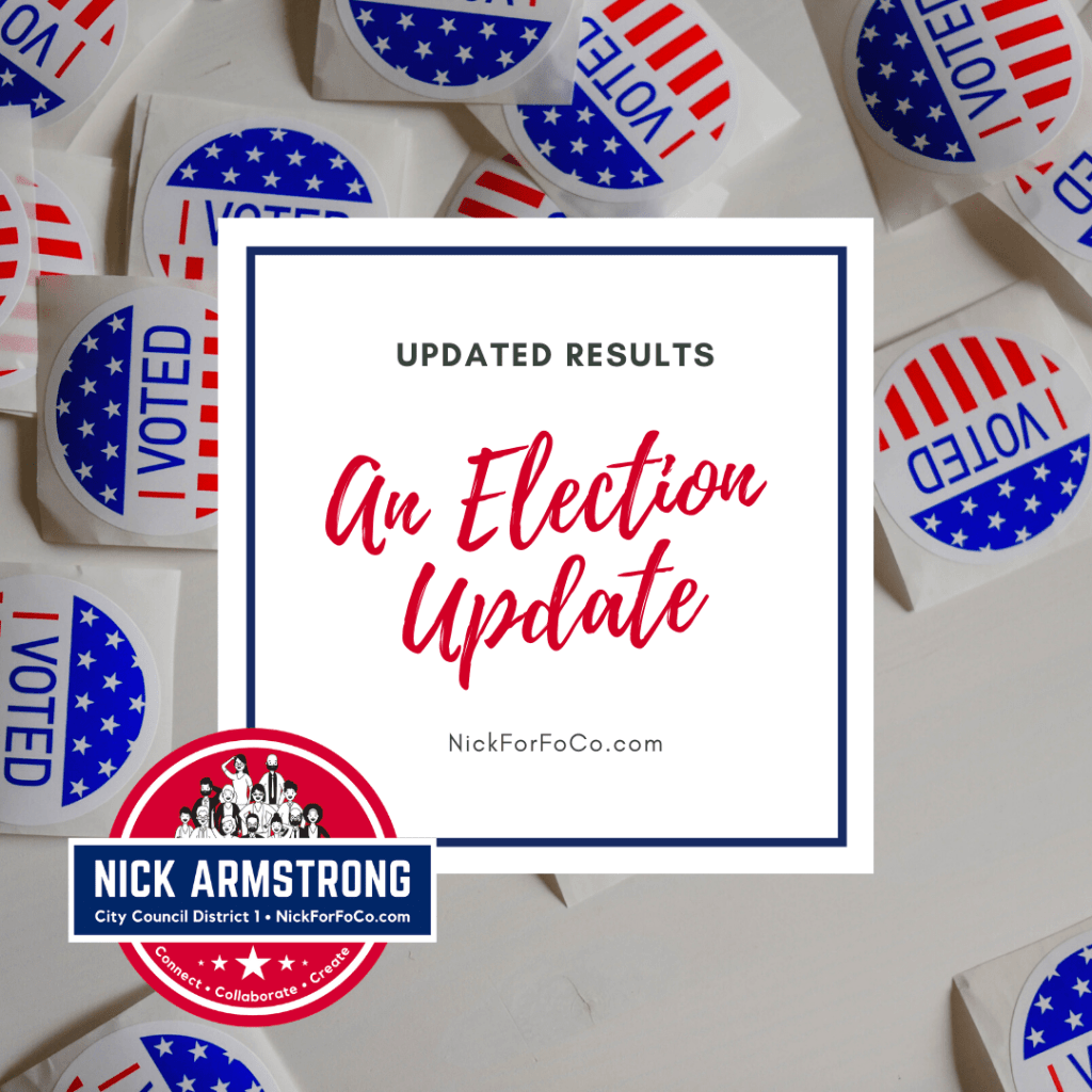 Today’s updated election results from the City of Fort Collins Government are posted: https://www.fcgov.com/elections/results
